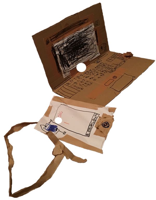 不器用でも扱いやすい、セロテープやガムテープをベタベタと多用して、ダンボールでデバイスやロボット(ペッパー)の顔のようなものを作っていました。(多分体まで行き着かなかった😂)